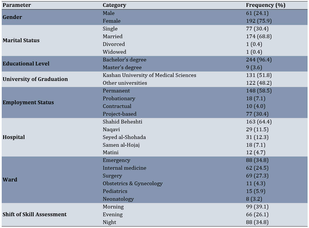 This descriptive–observational study was conducted in 2024 in hospitals located in Kashan. The study population consisted of nurses working in five hospitals affiliated with Kashan University of Medical Sciences. The sample size was determined based on the study by Ahlin et al. [14], considering a 95% confidence interval and a 5% margin of error, which resulted in 236 participants. Accounting for a 10% dropout rate, the final sample size was calculated to be 253. Sampling was performed using a non-probability quota method. After identifying the total number of nurses in each hospital, the sample size for each hospital was determined, and participants were then randomly selected from different wards. Nurses working in medical, surgical, obstetrics and gynecology, pediatrics, and emergency wards were included. Specialized units such as CCU, ICU, and hemodialysis, as well as injection units for specific patients, were excluded due to potential interference with the evaluation of venipuncture skills.