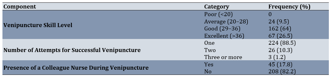 Accordingly, given the contradictory findings in this field, the numerous challenges faced by nurses in venipuncture, and the multiple factors influencing the accurate execution of this procedure, the present study aimed to determine the clinical competence of nurses in venipuncture and the associated factors in hospitals affiliated with Kashan University of Medical Sciences in 2024.