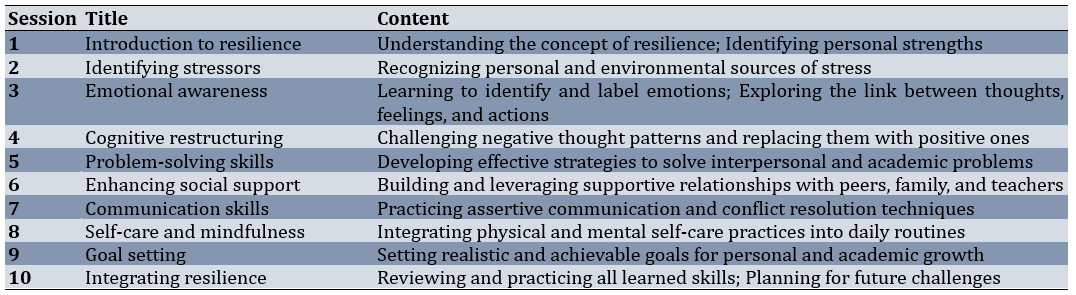 Following the random assignment of participants, a pre-test was administered to all three groups. The experimental groups then participated in their respective interventions. Resilience training was conducted over 10 weekly sessions of 75 minutes each (Table 1).