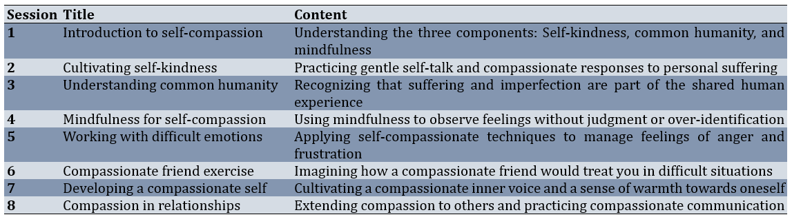 The compassion-focused therapy was implemented in 8 weekly sessions of 90 minutes (Table 2).