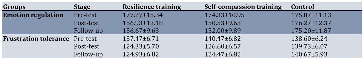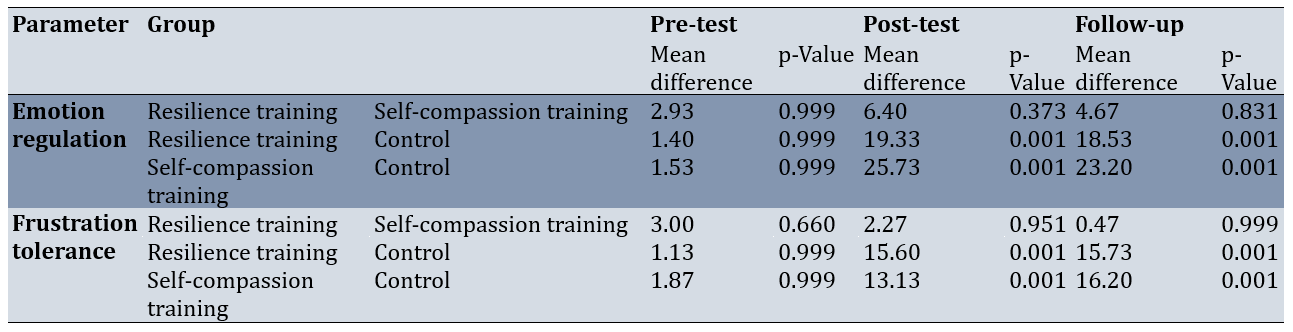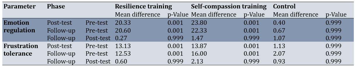 For emotion regulation, significant improvements from pre-test to post-test and follow-up were observed in both the resilience (p<0.001) and self-compassion groups (p<0.001), with no significant change in the control group. Similarly, frustration tolerance improved significantly in both experimental groups (p<0.001), but not in the control group (Table 5).
