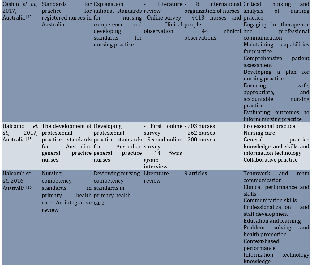 16. Halcomb E, Stephens M, Bryce J, Foley E, Ashley C. Nursing competency standards in primary health care: An integrative review. J Clin Nurs. 2016;25(9-10):1193-205. [