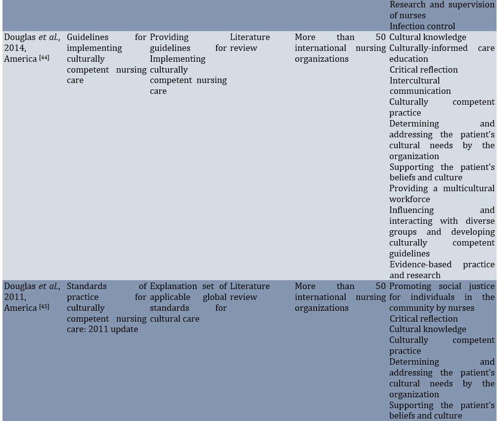 45. Douglas MK, Pierce JU, Rosenkoetter M, Pacquiao D, Callister LC, Hattar-Pollara M, et al. Standards of practice for culturally competent nursing care: 2011 update. J Transcult Nurs. 2011;22(4):317-33. [