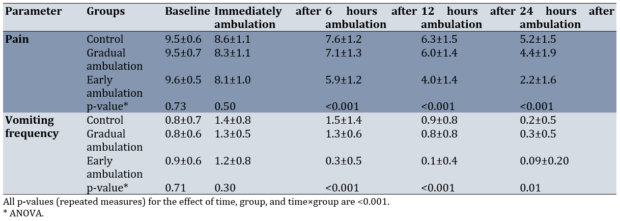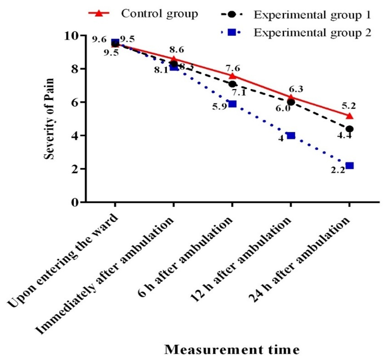 There was a decline in the mean intensity of pain in all three groups. Between-group comparisons indicated a more pronounced decrease in the early ambulation group compared to both the control group and the gradual ambulation group after six hours. Although a significant difference was observed between the gradual ambulation group and the control group at some time points, the decrease was most prominent in the early ambulation group. Similarly, Drolet et al. conducted a study in California in 2013 and concluded that ambulation results in a decrease in pain as well as the need for sedative drugs, leading to earlier discharge of patients from the ICU [28]. Alaa Eldin et al. showed that GA reduces pain among patients undergoing angiography [29]. In contrast, Vosouqian et al. stated that EA has no effect on the reduction of headache among patients undergoing cesarean sections [30]. After laparoscopic surgeries, pain usually results from phrenic nerve stimulation, the entry of laparoscopic gas into the peritoneum, and surgical incisions [31], which plays a critical role in increasing the length of hospital stay and treatment costs. In this context, some studies have indicated that rehabilitation and movement are more effective in reducing postoperative pain intensity compared to the size of surgical incisions [32, 33]. Walking after the operation may enhance the absorption of laparoscopic gases, thereby decreasing the intensity of abdominal pain [34].