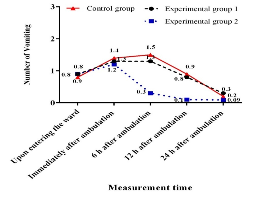 There was no significant difference among the three groups regarding the frequency of vomiting at baseline and immediately after ambulation. However, a significant difference was observed among the three groups in this regard at 6, 12, and 24 hours after ambulation (p<0.05; Figure 2). The frequency of vomiting was significantly lower in the EA group compared to the GA (p<0.001) and control (p<0.001) groups six hours after ambulation. However, the GA group did not show a significant difference from the control group in this respect. After 12 hours, the frequency of vomiting was significantly lower in the EA group compared to the GA (p=0.001) and control (p<0.001) groups. Nonetheless, no significant difference was found between the GA and control groups in this regard. After 24 hours, the frequency of vomiting was significantly lower in the EA group than in the GA group (p=0.01), but there was no significant difference from the control group (p=0.1; Table 2).
